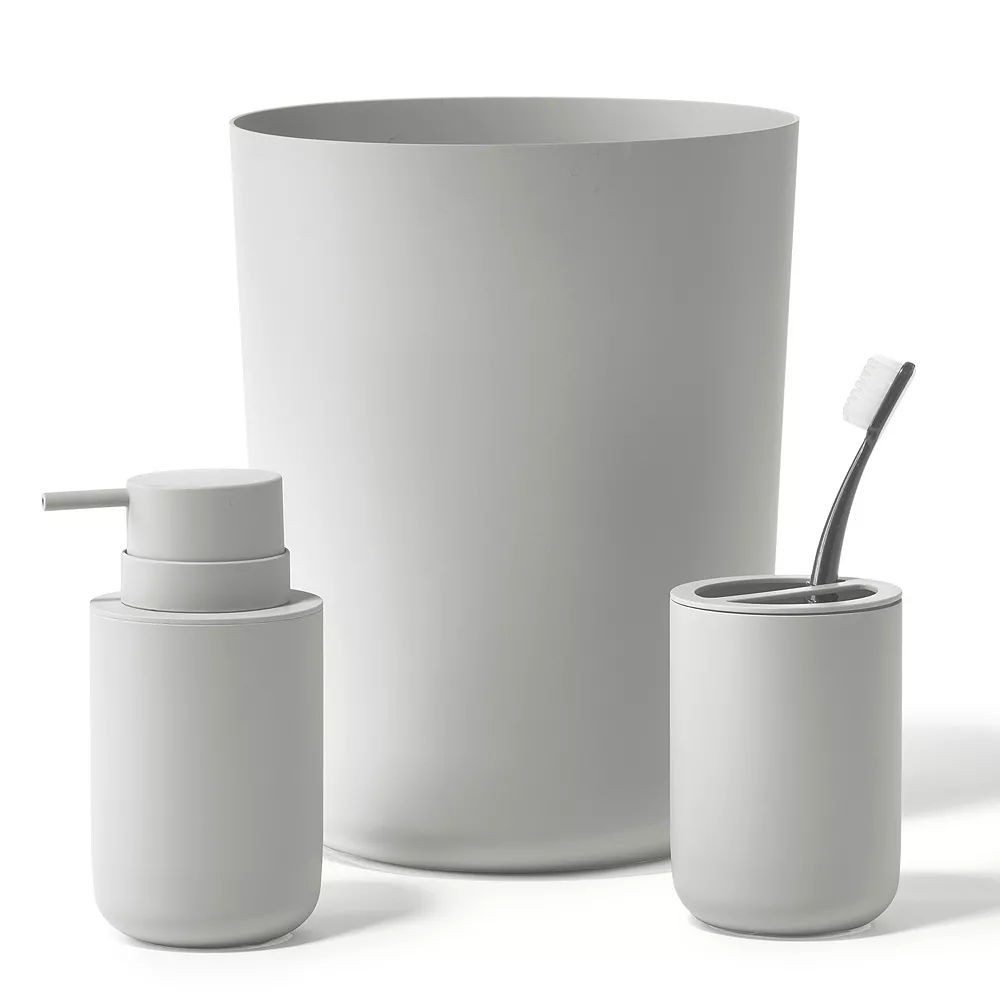 - 3 piece bath accessory set includes one waste basket, one soap pump, and one toothbrush holder