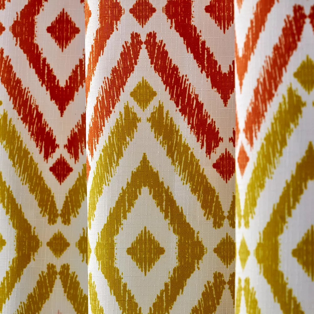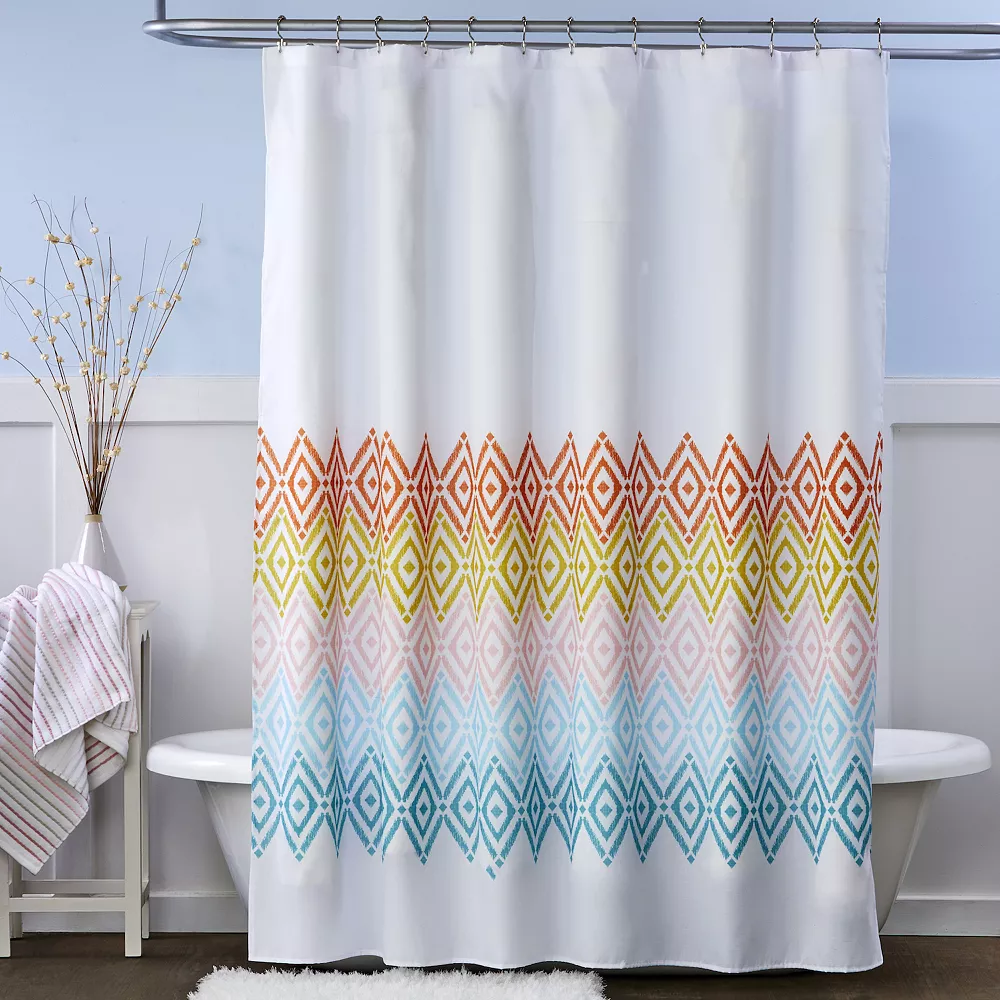 - Add pops of color to brighten up your space. The Palmas Geo shower curtain is lightweight and machine-washable for easy care and features a colorful, stacked geometric design. 12 button holes line the top for easy hanging. Use of a liner is recommended; liner and hooks not included.